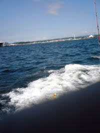 Todos em frente a um barco de pesca na baía de Tóquio.